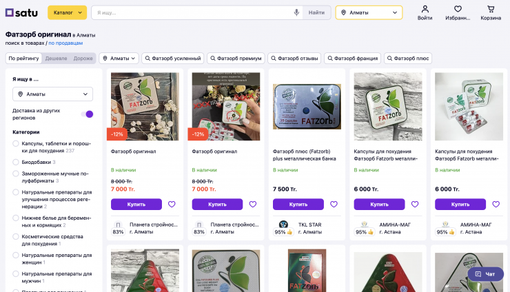 Выяснилось, что ранее эта биологически активная добавка (БАД) была зарегистрирована и в Казахстане. Однако, согласно данным Единого реестра свидетельств о государственной регистрации, с июня 2021 года регистрация отозвана. При этом данная добавка свободно продается в Казнете. Интернет-поиск выдает десятки объявлений о продаже капсул для похудений Fatzorb.