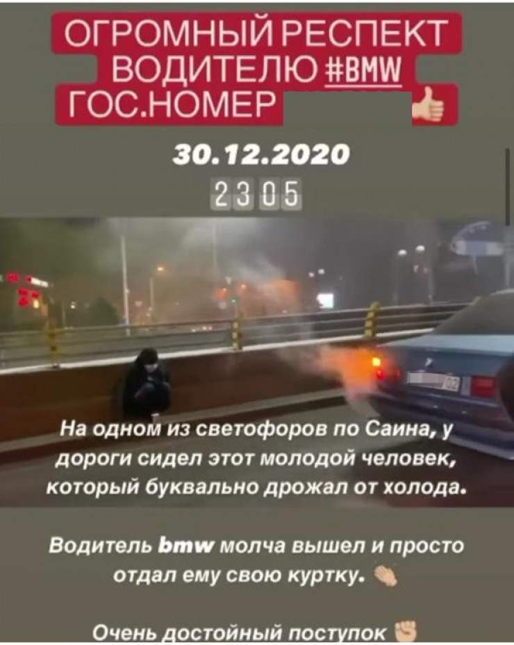 "На одном из светофоров по улице Саина у дороги сидел этот молодой человек, который буквально дрожал от холода. Водитель BMW молча вышел и просто отдал ему свою куртку. Очень достойный поступок", - написали очевидцы.