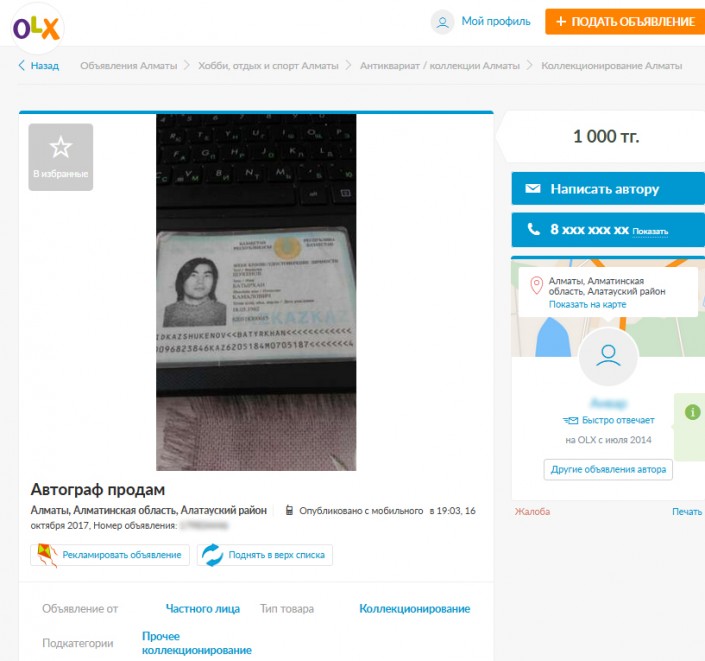 Продавца удостоверения личности Батырхана Шукенова могут посадить на 4 года - юрист Скриншот с olx.kz