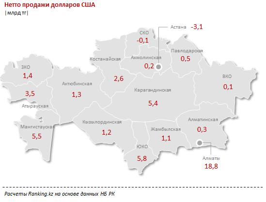 Лидирует же по положительному объему нетто-продаж обменными пунктами с большим отрывом Алматы - 18,8 миллиарда тенге (что все равно на 23,4 процента меньше, чем в марте).