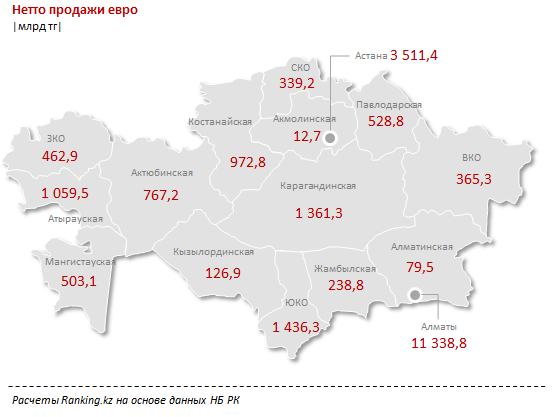 Объем нетто-продаж евро положительный во всех 16 регионах РК. Лидирует с большим отрывом Алматы - 11,3 миллиарда тенге, рост за месяц - на 25,4 процента.