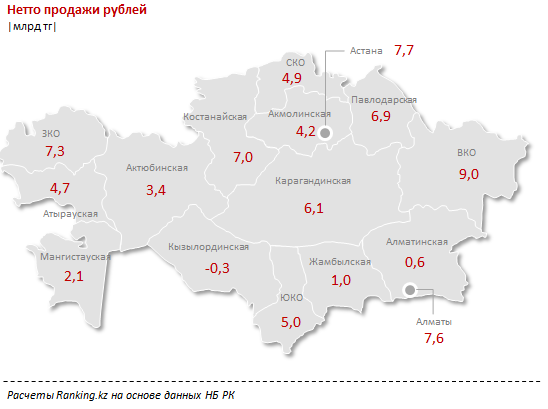 По объему нетто-продаж рублей обменными пунктами лидирует ВКО - 9 миллиардов тенге, рост за месяц на 29,3 процента.