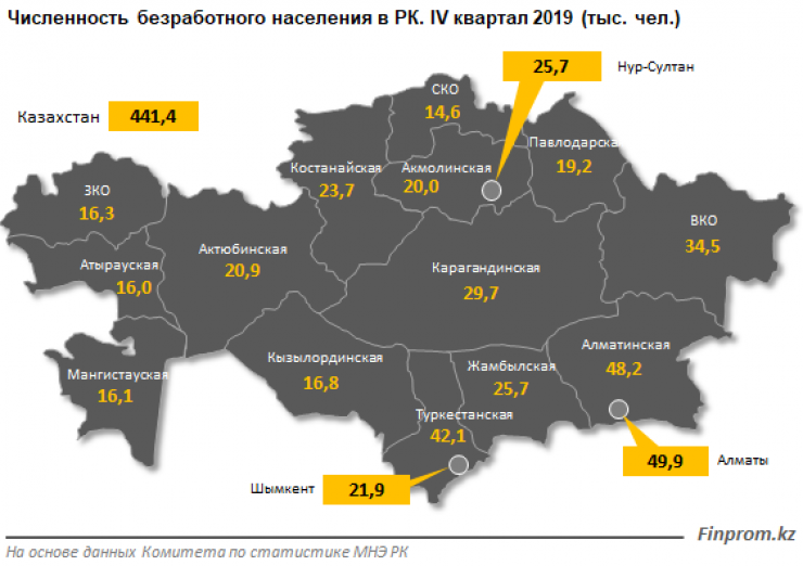 Больше всего безработных традиционно наблюдается в густонаселенных регионах - в Алматы (49,2 тысячи человек - плюс 0,8 процента за год), а также в Алматинской (48,2 тысячи человек) и Туркестанской (42,1 тысячи человек) областях.