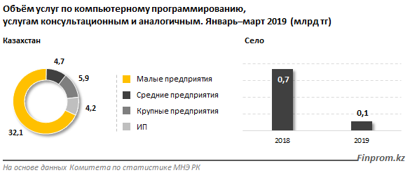 Примечательно, что более двух третей (68 процентов) объема услуг, связанных с компьютерным программированием, приходится на малые предприятия - 32,1 миллиарда тенге, а 4,2 миллиарда тенге - на индивидуальных предпринимателей.