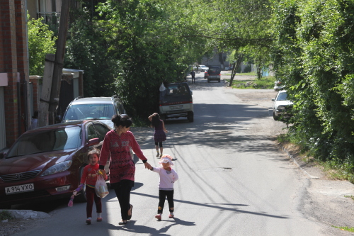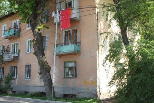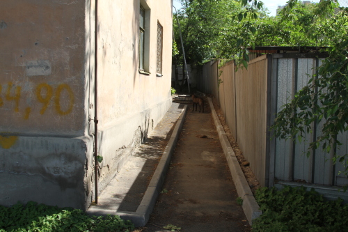Напротив нее - дома "хрущевской" постройки - двухэтажные, кирпичные, с обшарпанными стенами желтоватого цвета.