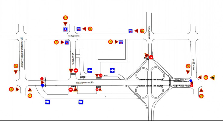 "Движение транспорта частично будет организовано по местному проезду вдоль проспекта Мәңгілік Ел, от улицы Керей, Жәнібек хандар до улицы Сығанақ и от внутриквартальной дороги со стороны Конституционного совета до улицы Алматы, в одностороннем порядке", - уточнили в полиции