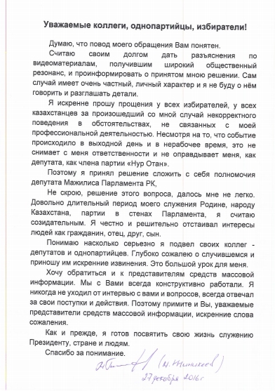 Я искренне прошу прощения у всех избирателей, у всех казахстанцев за произошедший со мной случай некорректного поведения в обстоятельствах, не связанных с моей профессиональной деятельностью. Несмотря на то, что событие происходило в выходной день и в нерабочее время, это не снимает с меня ответственности и не оправдывает меня, как депутата, как члена партии "Нур Отан".