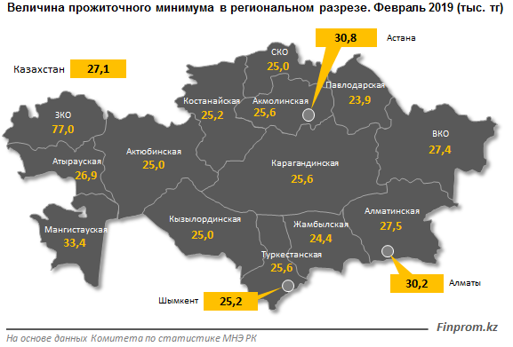 На конец февраля 2019 года только в пяти регионах величина прожиточного минимума превысила среднереспубликанское значение: в Мангистауской области прожиточный минимум выше среднереспубликанского значения на 23,3 процента, в Астане - на 13,5 процента, в Алматы - на 11,4 процента, в Алматинской области - на 1,6 процента, в ВКО - на 1,1 процента.