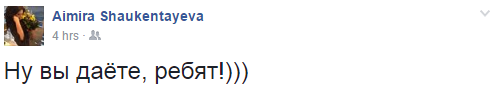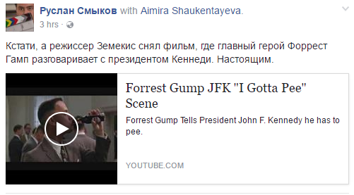 Стоит отметить, что сами создатели видео -  журналист Первого канала "Евразия" Руслан Смыков и главная "героиня" ролика, телеведущая Аймира Шаукентаева, предпочли отшутиться. "Ну вы даёте, ребят!)))", - прокомментировала резонансный инцидент на своей странице в Facebook Шаукентаева. В свою очередь, Смыков отметил, что режиссер Роберт Земекис снял фильм, где главный герой Форрест Гамп разговаривает с президентом Кеннеди. "Настоящим", - подчеркнул журналист, опубликовав у себя на "стене" отрывок из фильма.
