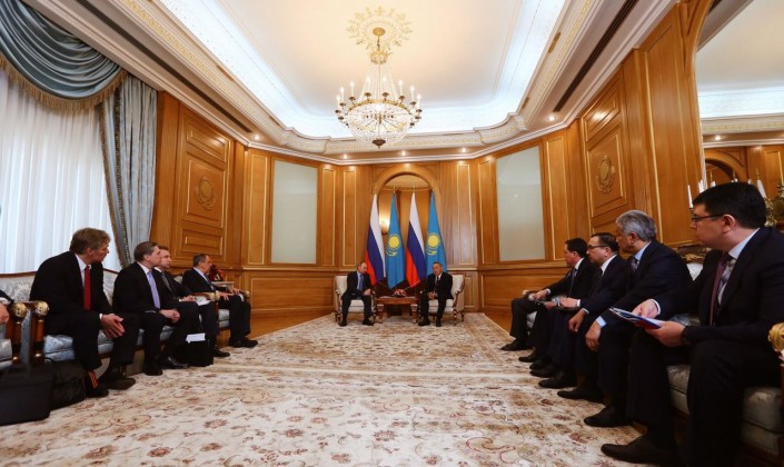 Встреча Назарбаева и Путина 27 февраля проходит в резиденции Президента в Алматы. В ходе переговоров обсуждается широкий спектр вопросов двустороннего сотрудничества, а также региональной и международной повестки дня. Как сообщалось ранее на сайте Кремля, главы Казахстана и России обсудят актуальные вопросы двустороннего сотрудничества в торгово-экономической и культурно-гуманитарной сферах, в энергетике и космосе, а также ключевые международные вопросы. Лидеры также затронут некоторые аспекты дальнейшего продвижения евразийской интеграции.
