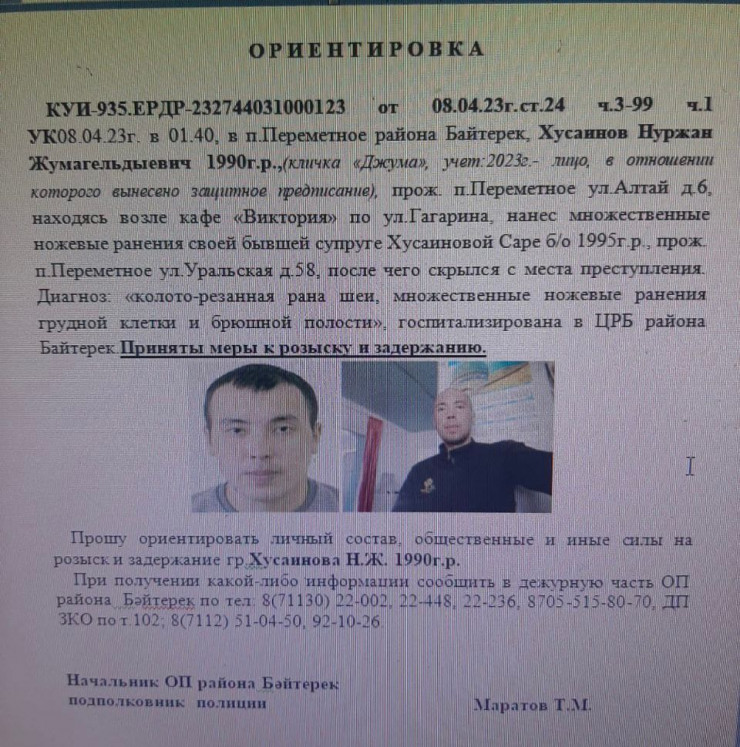 Информацию подтвердили в пресс-службе Департамента полиции Западно-Казахстанской области. Сообщается, что 8 апреля около двух часов ночи в поселке Переметное района Байтерек 33-летний мужчина, находясь возле одного из кафе, нанес множественные ножевые ранения своей 28 летней супруге, после чего скрылся с места преступления.