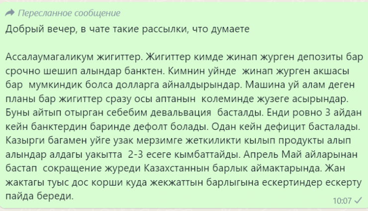 В WhatsApp распространяется сообщение, в котором говорится о дефолте и дефиците продовольствия в Казахстане. Автор призывает людей срочно покупать недвижимость, переводить имеющиеся накопления в валюту, а также скупать нескоропортящиеся продукты и делать большие запасы. В Министерстве сельского хозяйства РК опровергли слух о том, что в стране может случиться скорый дефицит продовольствия, передает Tengrinews.kz со ссылкой на StopFake.kz.