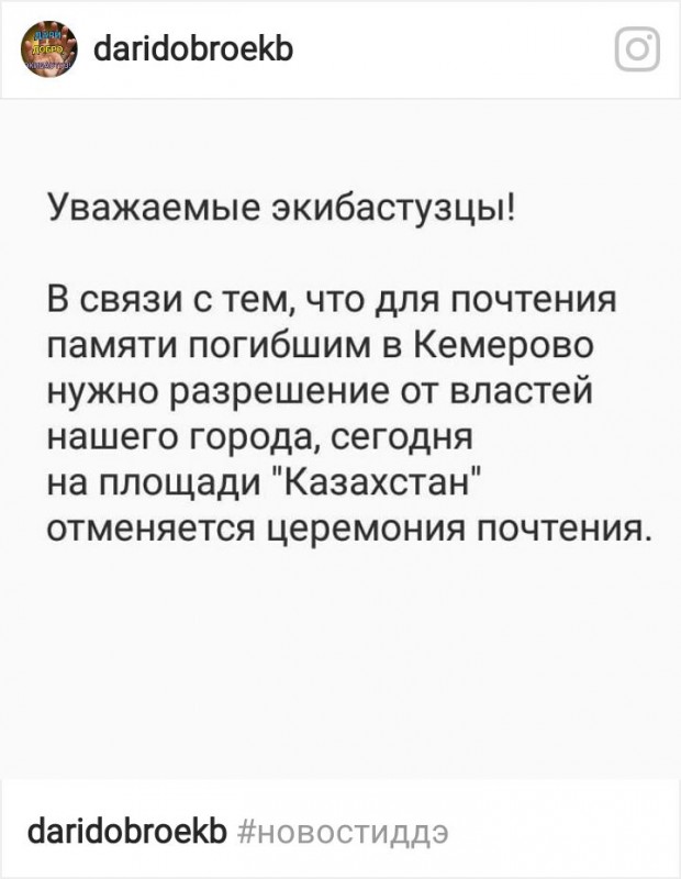 "Здравствуйте. Сегодня в 20.00 на набережной Центрального парка состоится церемония почтения памяти погибших в торговом центре в Кемерово. Пожалуйста, по возможности распространите эту информацию".
