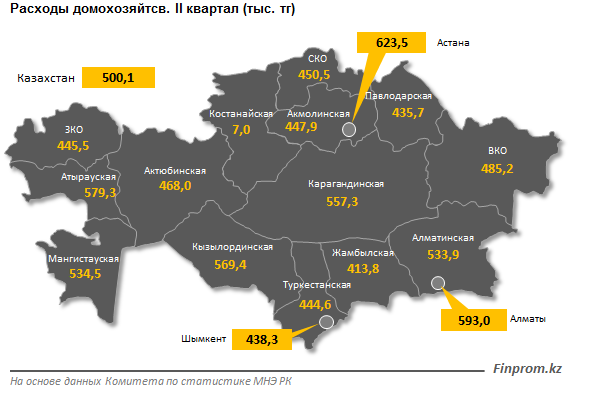 Наибольшие расходы несут домохозяйства Астаны - 623,5 тысячи тенге (годом ранее - 585,5 тысячи тенге).
