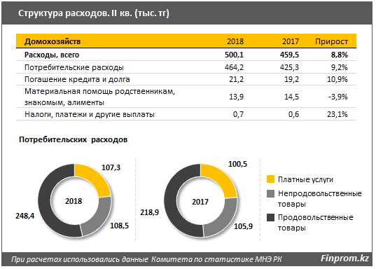 Почти половина расходов (49,7 процента) уходит на еду. Расходы домохозяйств во втором квартале 2018 года выросли на 8,8 процента, с 459,5 до 500,1 тысячи тенге.