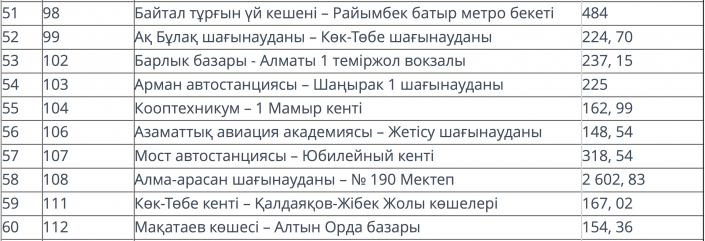 На третьем месте оказался маршрут № 108 "микрорайон Алма-Арасан - Школа № 190", который оценили в 2 602,83 тенге за одну поездку. Отметим, что в ноябре 2017 года стоимость проезда на этом маршруте была оценена в размере 1 431,40 тенге.