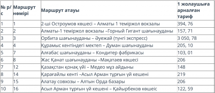 В ноябре 2017 года депутаты маслихата Алматы VI созыва утвердили тарифы для субсидирования 44 маршрутов. Тогда в профильном управлении поясняли, что стоимость перевозки одного пассажира зависит от того, сколько людей ездят на этом маршруте, стоимости автобуса и других затрат. Себестоимость проезда может меняться каждый месяц, в зависимости от пассажиропотока.