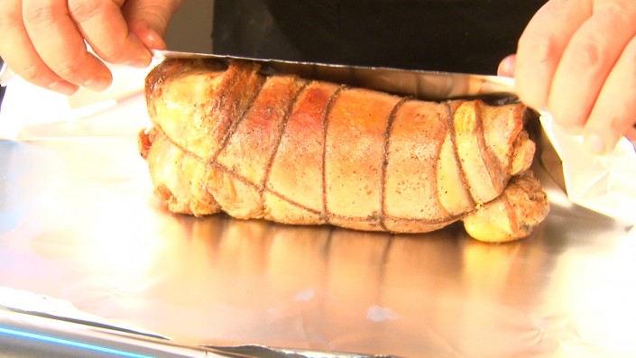 Заготовка обжаривается на сковородке с небольшим количеством масла до образования золотистой корочки. На сковородку можно также бросить несколько веточек розмарина и тимьяна, чеснока, чтобы мясо впитало аромат не только внутри, но и снаружи. После этого рулет заворачивается в фольгу швом вниз и помещается в духовку, в зависимости от размера заготовки, в среднем на полтора часа при температуре 180 градусов.