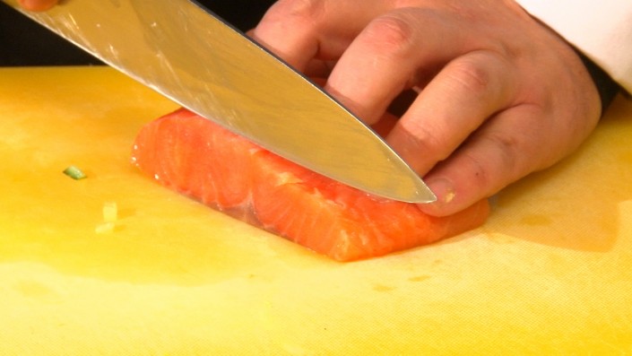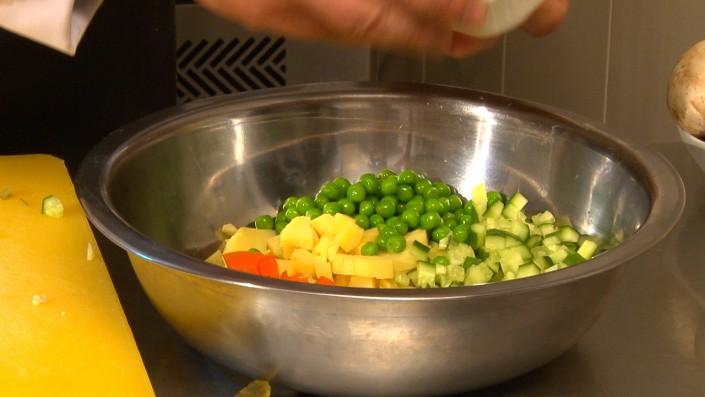 Основной ингредиент в салате - это около 200 грамм филе копченой семги. В целом, повар отмечает, что для этого блюда подойдет и любая другая соленая рыба. Все ингредиенты нарезаются небольшими кубиками, за ориентир шеф советует взять размер одного горошка, а после добавляются в емкость небольшими раздельными горстями. Это делается для того, чтобы можно было следить за пропорциональным количеством всех ингредиентов. Рыба хорошо сочетается с зеленью, поэтому шеф советует добавить немного укропа.
