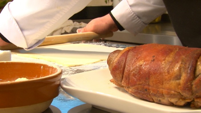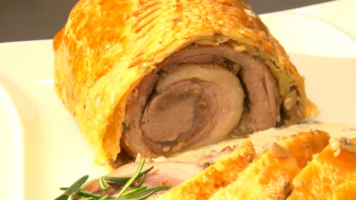 В качестве дополнения к основным горячим блюдам на праздничный стол шеф-повар ресторана "Бульбашъ" Александр Трегубенко предложил приготовить рулет из ягненка, фаршированного грибами и запеченного в тесте.