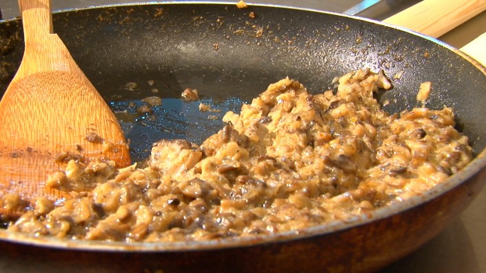 Пока рулет в духовке, можно приготовить начинку, которая будет между мясом и тестом. Для этого потребуется около 700-800 грамм шампиньонов, одна луковица, несколько долек чеснока. Все это обжаривается на сковородке. Во время этого можно добавить немного соли, а после того как жидкость с грибов испарится, добавить 200 грамм жирных сливок. Начинка рулета тушится до густого состояния.