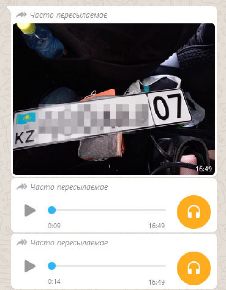 В распространяемом сообщении мужской голос сообщает, что казахстанцам разрешили ставить на учет в Казахстане купленные в России автомобили за 102 тысячи тенге. В подтверждение автор рассылки прикрепил фотографию номерного знака.