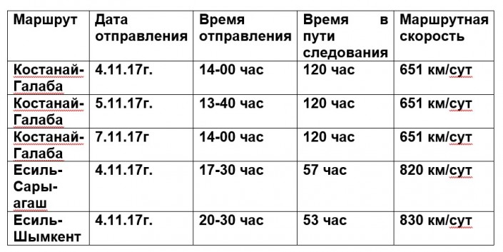 Три прямых маршрута сообщением Костанай - Галаба (ИРА) отправлены на днях с казахстанской станции Костанай согласно утвержденному графику. Составы, груженные мукой, преодолеют расстояние в 3 257 километров за 120 часов. Данный маршрут реализован АО "КТЖ - Грузовые перевозки" в рамках проекта по рациональному использованию и своевременной отправке подвижного состава. Движение грузовых поездов осуществляется по утвержденному расписанию и маршруту, аналогичному пассажирскому движению.