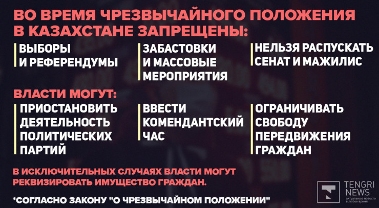 В Казахстане действует режим чрезвычайного положения. О том, какие ограничения для казахстанцев подразумевает закон "О чрезвычайном положении" и какими полномочиями он наделяет властные структуры, в материале Tengrinews.kz.