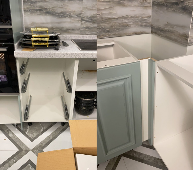"По договору в первую очередь они должны были привезти кухонный гарнитур, но начали со шкафов. Сначала привезли их каркас и установили. Причем детали привозили частями: один раз - половину шкафа, еще через неделю или 10 дней - другую часть. А о качестве я вообще молчу, мебель в ужасном состоянии: детали привозили с трещинами, резали их неправильно. Я уже была согласно и на такое, лишь бы собрали мне мебель. Но сборщики и этого не сделали.