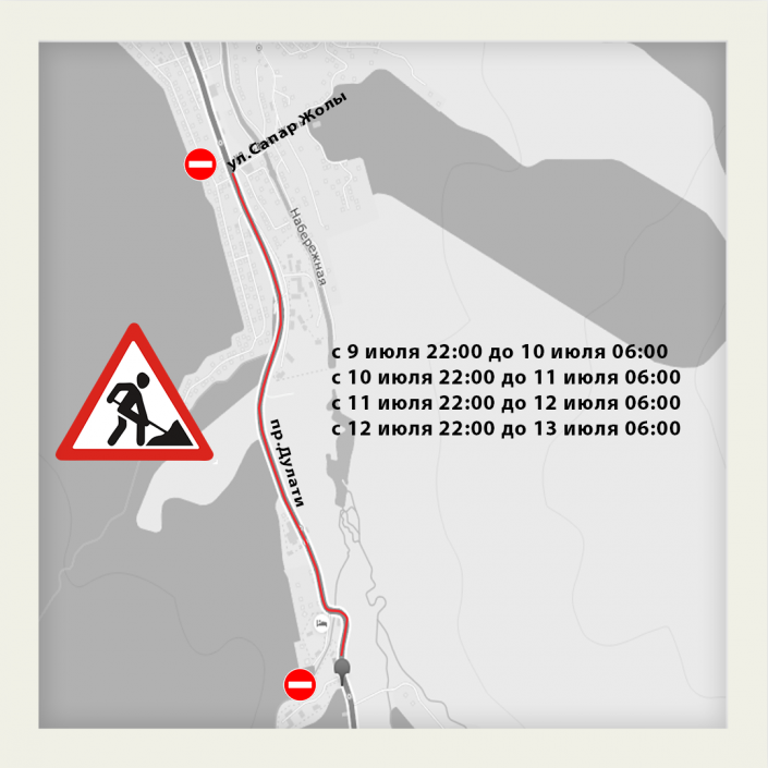 Также в связи с ремонтом дороги по проспекту Дулати участок от экологического поста до улицы Сапар Жолы 9, 10, 11 и 12 июля будет перекрыт с 22:00 до 6:00.
