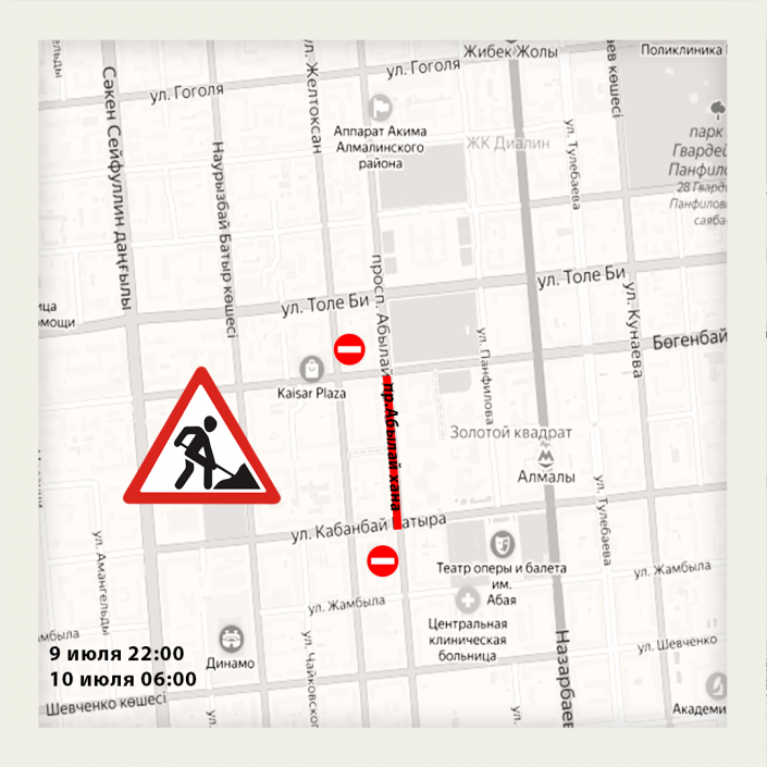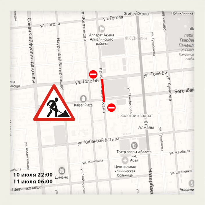 Также с 10 июля 22:00 до 6:00 11 июля будет закрыт проезд на участке от улицы Богенбай батыра до Толе би.