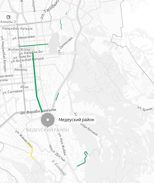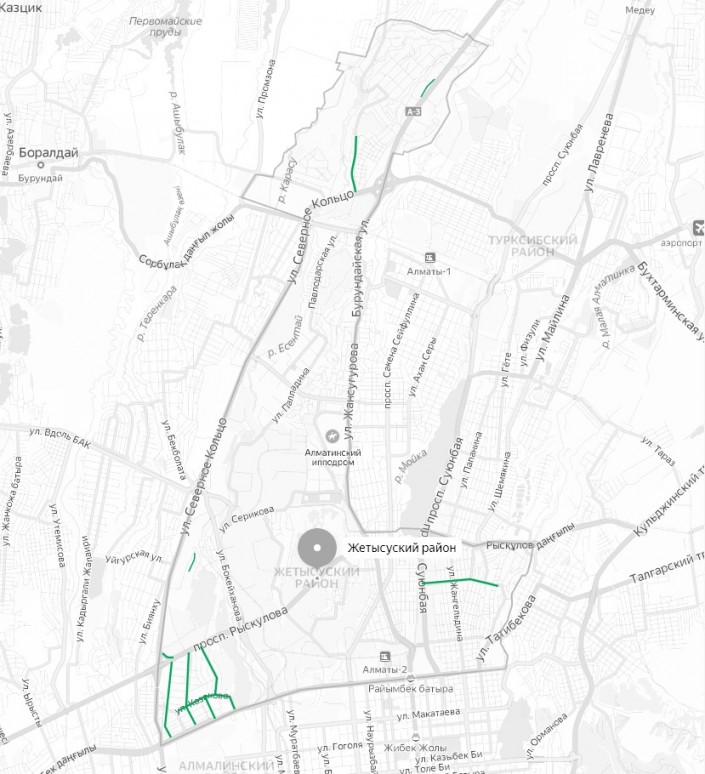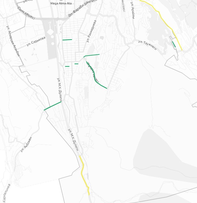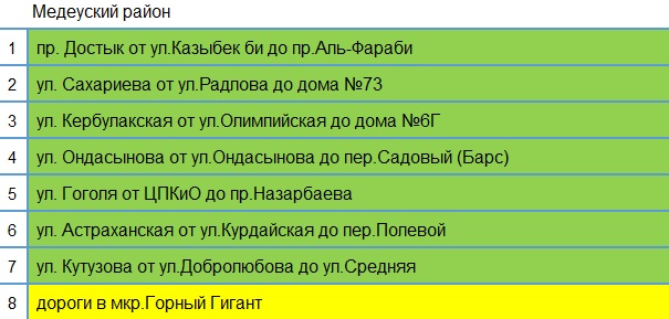 В Медеуском районе отказались от ремонта на двух улицах: Турксибской от улицы Оспанова до дома № 52 и Олимпийской от улицы Олимпийской до Тышканбаева. Дороги в микрорайон Горный гигант все еще перекрыты.