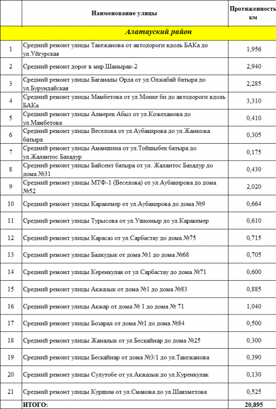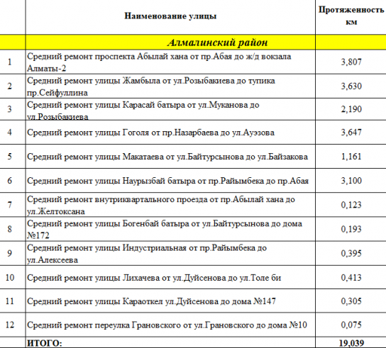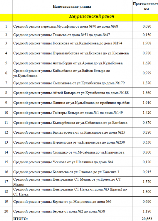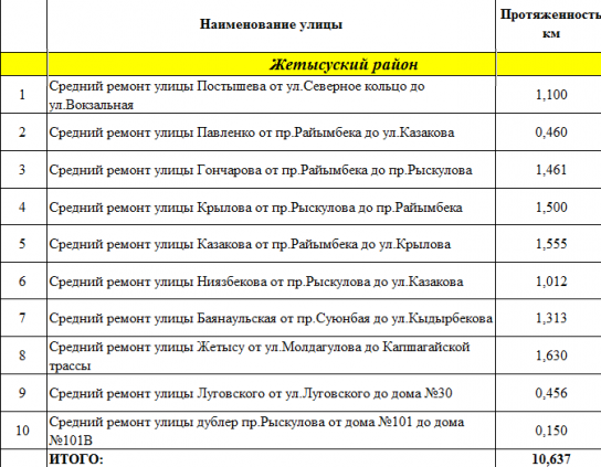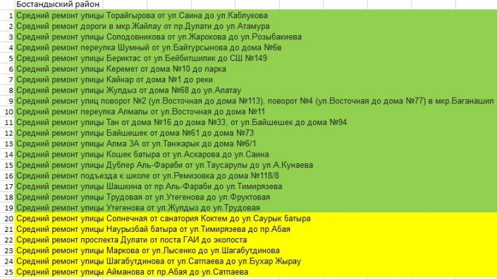 В Бостандыкском районе, наоборот, вместо изначально запланированных 20 улиц работы начали на 25. Ремонт все еще идет на шести улицах (в таблице они отмечены желтым цветом).
