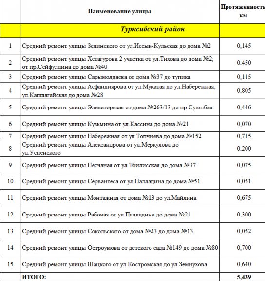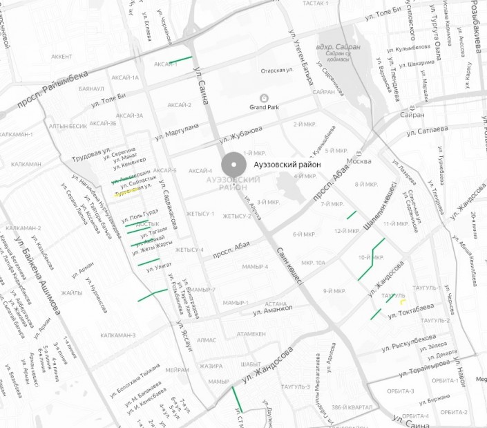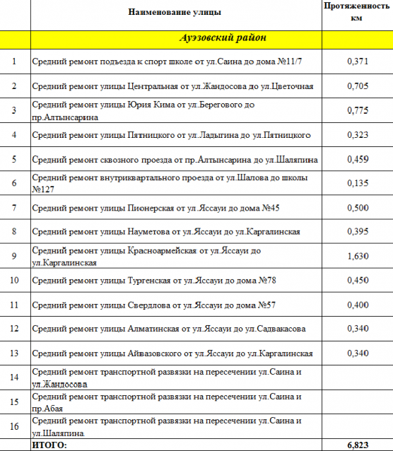 А вот в Ауэзовском районе ремонтировали 13 улиц вместо запланированных ранее 16. Ремонт так и не дошел до транспортных развязок на пересечении улиц Саина и Жандосова, улицы Саина и проспекта Абая, улиц Саина и Шаляпина. Кроме того, ремонт все еще идет на  внутриквартальном проезде от улицы Шалова до школы № 127 и на улице Тургенская от улицы Яссауи до дома № 78.