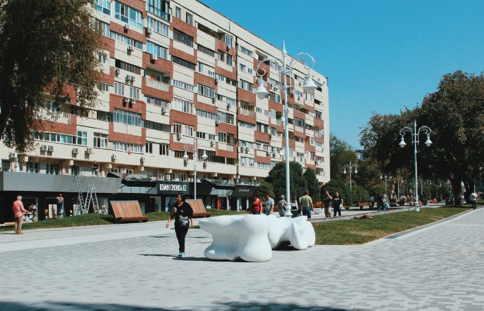 По всей улице были установлены сухие фонтаны с подсветкой в ночное время, скамейки, урны, оригинальные фонари освещения, авторские малые архитектурные формы, а также современные детские площадки.