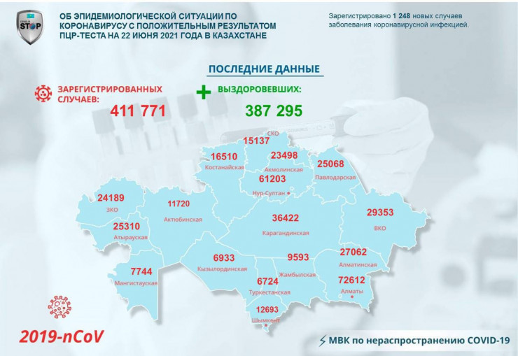 За прошедшие сутки (по данным на 22 июня) в Казахстане зарегистрировано 1248 новых случаев заболевания коронавирусной инфекцией, передает Tengrinews.kz со ссылкой на МВК по нераспространению COVID-19.