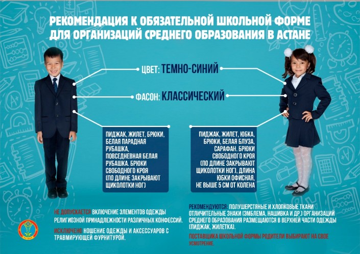 Также на школьной форме размещаются отличительные знаки (эмблема, нашивка и другое) организаций среднего образования. Они размещаются в верхней части одежды или аксессуара (пиджак, жилетка). Эскиз эмблемы можно будет получить в школе или скачать на сайте школы. Требования к школьной форме исключают одежду и аксессуары с травмирующей фурнитурой.