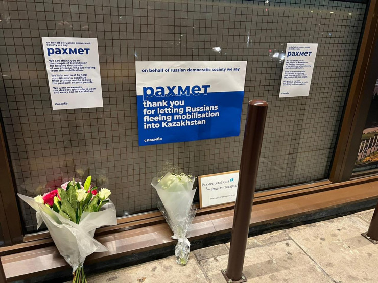 В соцсетях распространяются кадры из Лондона, снятые у посольства Казахстана в Великобритании. Здание расположено по улице Пэлл-Мэлл. На опубликованных снимках видно, как люди оставляют у нашего посольства цветы, письма и плакаты в знак благодарности Казахстану, который уже больше недели принимает россиян. На плакатах написаны слова благодарности "Көп рахмет" и "Thank you", а также отмечается, что казахстанцы сейчас спасают россиян.