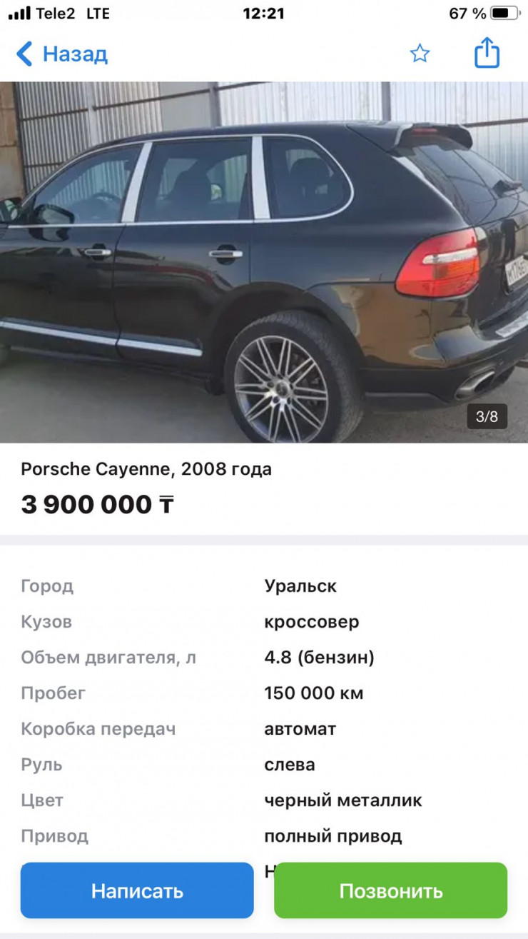 Свой Porsche, как заявил Сергей Тарасов, он обнаружил на сайте Kolesa.kz, он там стоял первым в этой категории марок. Однако после того, как он подал заявление в местную полицию и причастных к незаконному пересечению автомобиля допросили, Porsche с продажи тут же сняли.