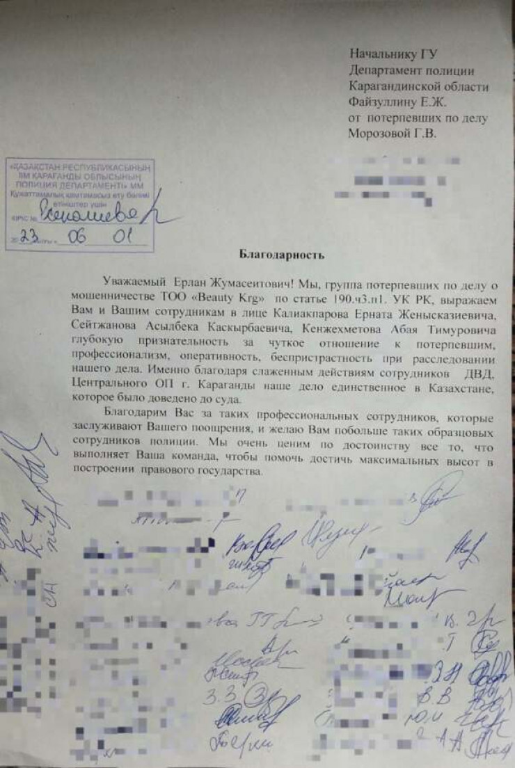 Группа потерпевших написала письмо на имя начальника ДП Карагандинской области Ерлана Файзуллина.