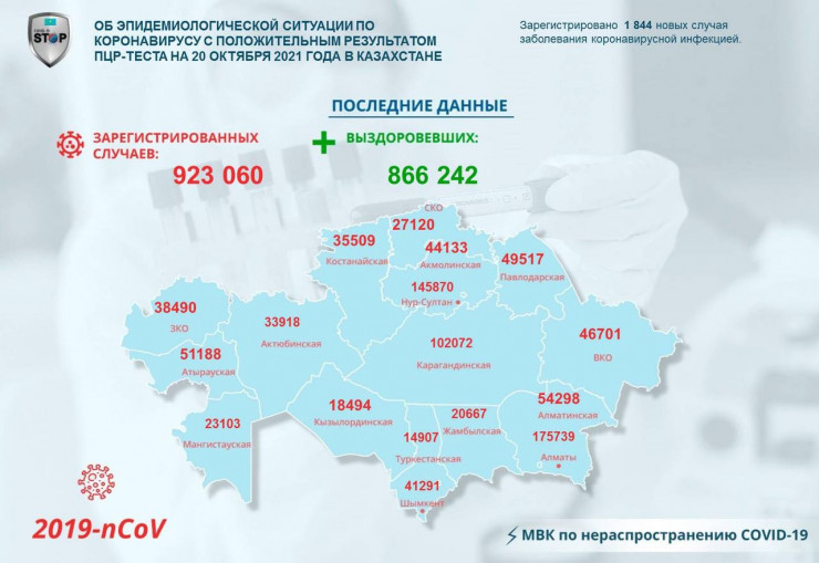 За прошедшие сутки (20 октября) в Казахстане зарегистрировано 1 844 новых случая заболевания коронавирусной инфекцией, передает Tengrinews.kz со ссылкой на данные МВК по нераспространению COVID-19.