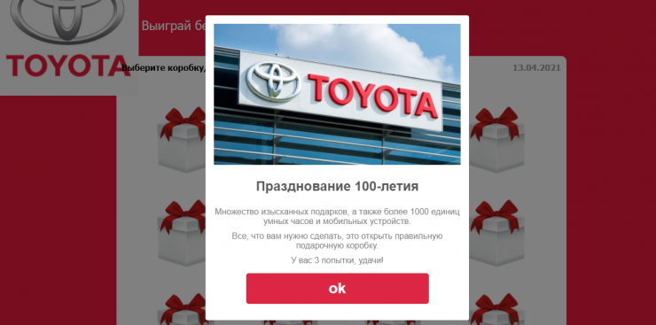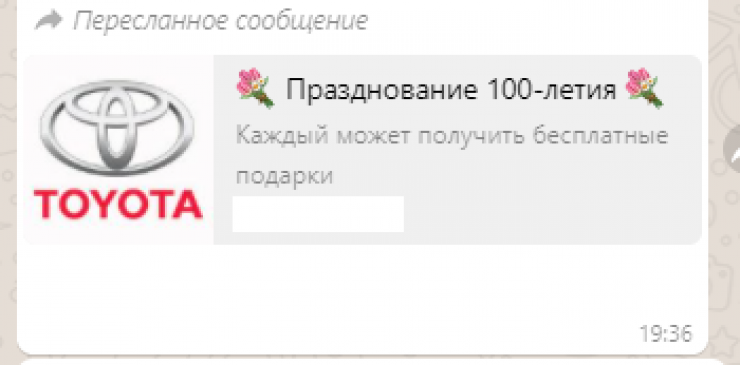 В мессенджере WhatsApp рассылается приглашение принять участие в розыгрыше автомобиля, который проводится якобы в честь 100-летнего юбилея компании Toyota. Официальный дилер бренда в Алматы и Нур-Султане опроверг информацию. Портал StopFake предупредил доверчивых казахстанцев, что таким образом их заманивают на фишинговые сайты, передает Tengrinews.kz.