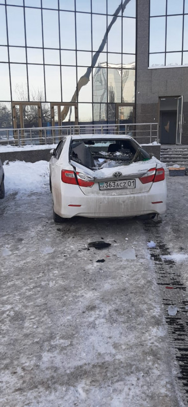 В Алматы рухнувшие с крыши 33-этажного жилого комплекса Orion сосульки разбили три авто марки Toyota, передает Tengrinews.kz.