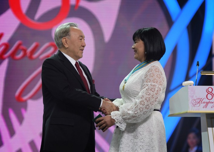 После поздравительной речи Президент вручил многодетным матерям нагрудные знаки "Алтын алқа" и "Күміс алқа". Жительница Южно-Казахстанской области Айгуль Тузельбаева была удостоена золотой подвески, а жительница Астаны Раушан Аяганова - серебряной.