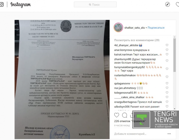 "2019 жылдың 1 наурызында күнделікті әлеуметтік желілерде мониторинг жүргізу барысында Instagram желісінде "Шалқарлық ТӨРТҚАРА бауырларға" атты жағымсыз ақпарат жарияланғандығы анықталды (сол мезетте, Instagram желісінен "Шалқарлық ТӨРТҚАРА бауырларға" атты жағымсыз ақпарат өшірілді). Аталған дерек бойынша Ақтөбе облысы Әділет департаменті тексеріс жүргізіп, нәтижесінде Шалқар аудандық Әділет басқармасының іс жүргізушісі А.Күзембаев өз қызметтік бабын пайдаланып пакеттер үшін арналған мөрді басып, құттықтау сөз жазу арқылы дайындалған құжатты Whatsapp мессенджері арқылы таратқандығы анықталды", - делінген ведомство жауабында.