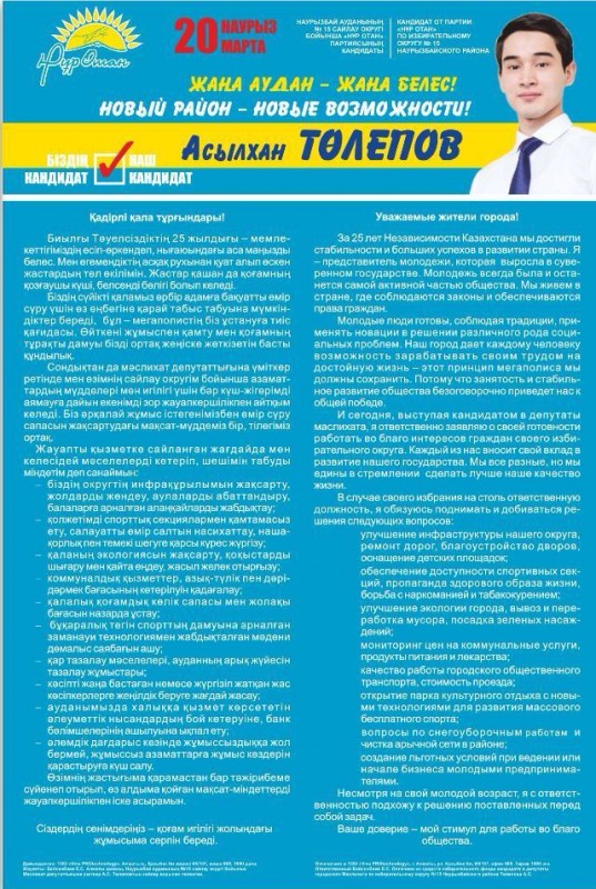 "Критика, наоборот, придает мне силы и стимул для работы. Я ни на кого не обижаюсь, уважаю мнение каждого человека, кто высказался. Поэтому я не на словах, а на деле хочу доказать, что народ меня выбрал не зря. Понимаю недоверие людей, говорят, что я слишком молодой. Но, если посмотреть в истории казахов, наши предки становились великими батырами и биями и в 14 лет, и в 20 лет. Поэтому я думаю, что возраст - это не главное. Я даю слово, что буду много работать и оправдаю доверие своих избирателей", - сказал Толепов.