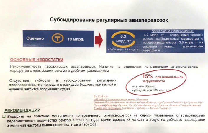 "Расходы на субсидирование регулярных авиаперевозок оценили в 19 миллиардов тенге. Мы предлагаем 8,3 миллиарда тенге оптимизировать. Основную проблему мы видим в отсутствии гибкости в субсидировании регулярных авиаперевозок, что приводит к расходам бюджета при низкой и нулевой загруженности воздушного судна. Особенно по туристическим маршрутам, которые субсидируются", - сообщила Годунова на презентации проекта республиканского бюджета на 2020-2022 годы в Мажилисе.