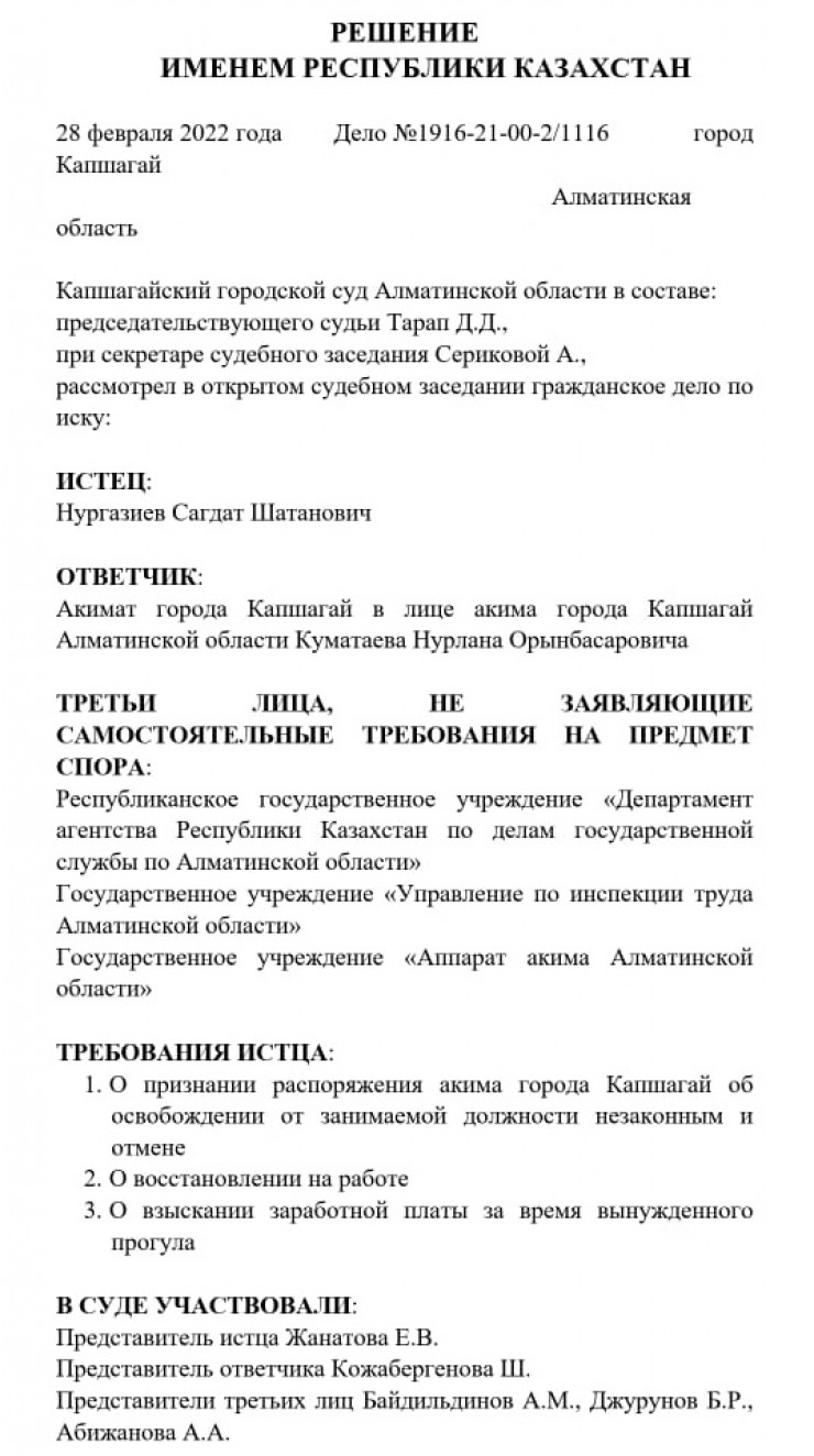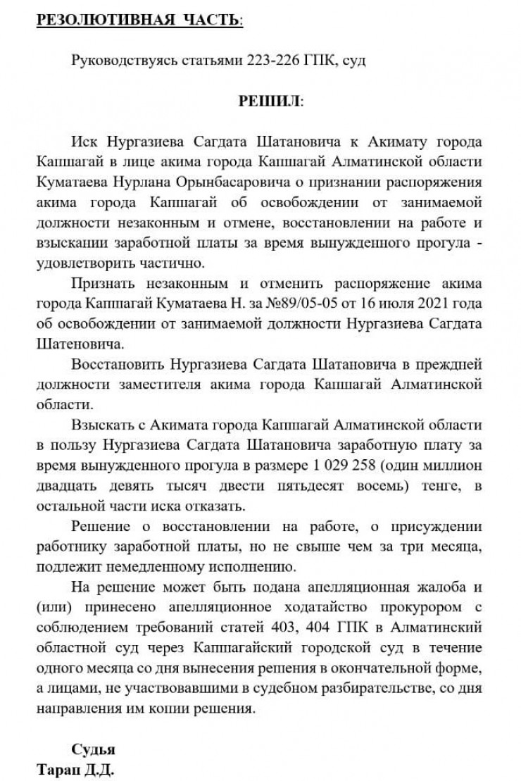 Сагдат Нургазиев ушел с поста заместителя акима Капшагая из-за нарушений Гражданско-правового кодекса. С данным решением чиновник не был согласен и обратился в суд.