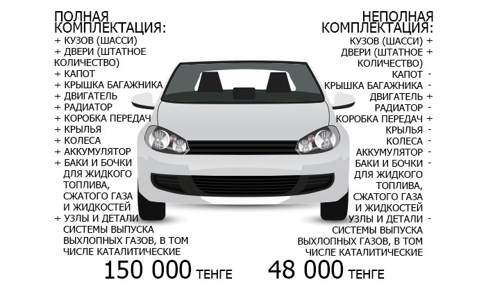 В программе могут участвовать автомобили категории М1. Это легковые автомобили массой не более 3,5 тонны или имеющие не более семи посадочных мест. Ограничений по году выпуска и сроку владения автотранспортным средством нет. Авто может быть как на ходу, так и нет. Аварийные автомобили допускаются к участию в программе утилизации при наличии необходимой комплектации и возможности ее определения. Владелец вышедшего из эксплуатации автомобиля с полной комплектацией может рассчитывать на полную сумму компенсации в 150 тысяч тенге. За авто с неполной комплектацией - 48 тысяч тенге.