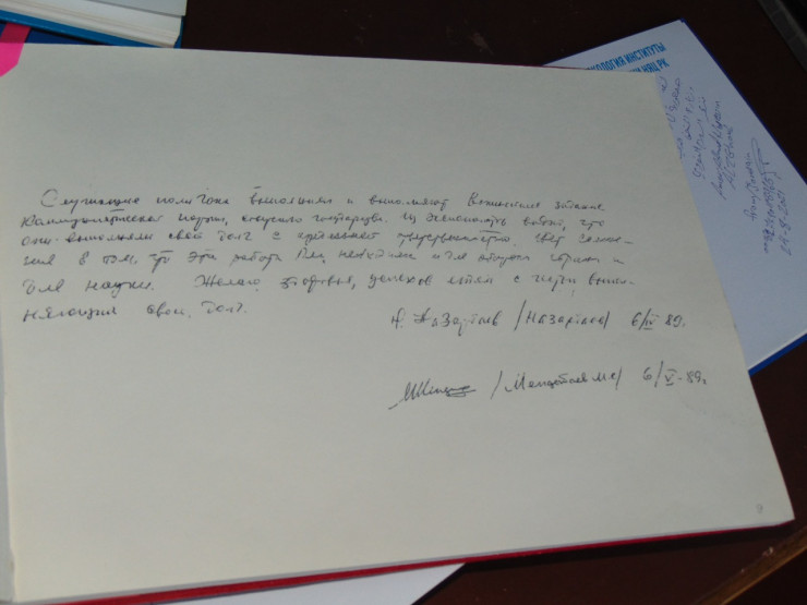 Сразу же показывают журнал с отзывами посетителей. Журнал раскрыт на странице с записью, сделанной Нурсултаном Назарбаевым.